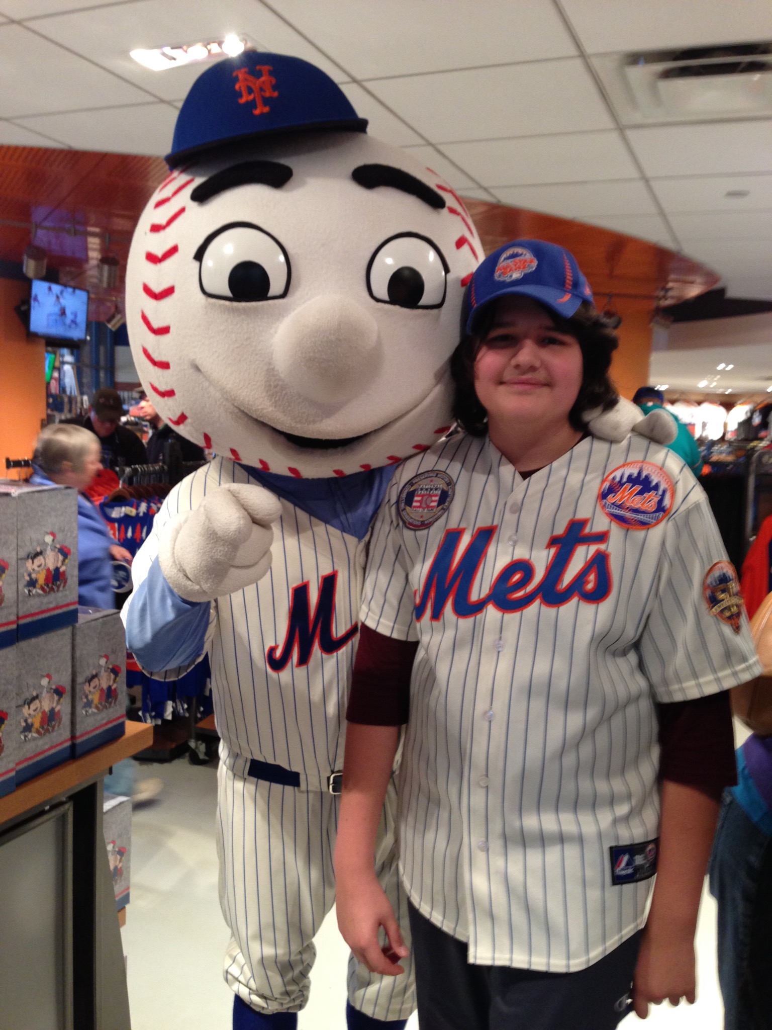 The Inaugural Citi Field FallFest was held yesterday at the grand home of the Mets. The festivities took place in the outfield concourse by the Shea Bridge. While the event opened at 12pm, I got there at around 12:20. I first went to the Mets Food Drive, where I donated 10 non-perishable items and received a voucher for a future April game (awesome!). 2 other things happened at the Team Store, first I got my first real photo with Mr.Met. I’ve seen him walk down the aisles before, but when everyone asks him for photos, he just sticks his arm out as if saying “Your Awesome”, but then just continues down the aisle. I guess Mets PR, decided to do this because he’s on a strict schedule and is probably very busy. Anyway, here’s the photo: